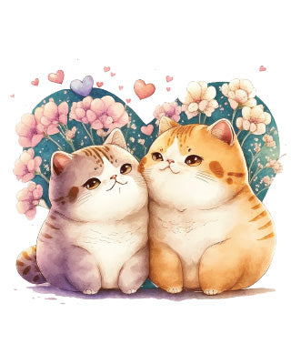 קעקוע זמני צבעוני על שני חתולים ומאחוריהם פרחים ולבבות.